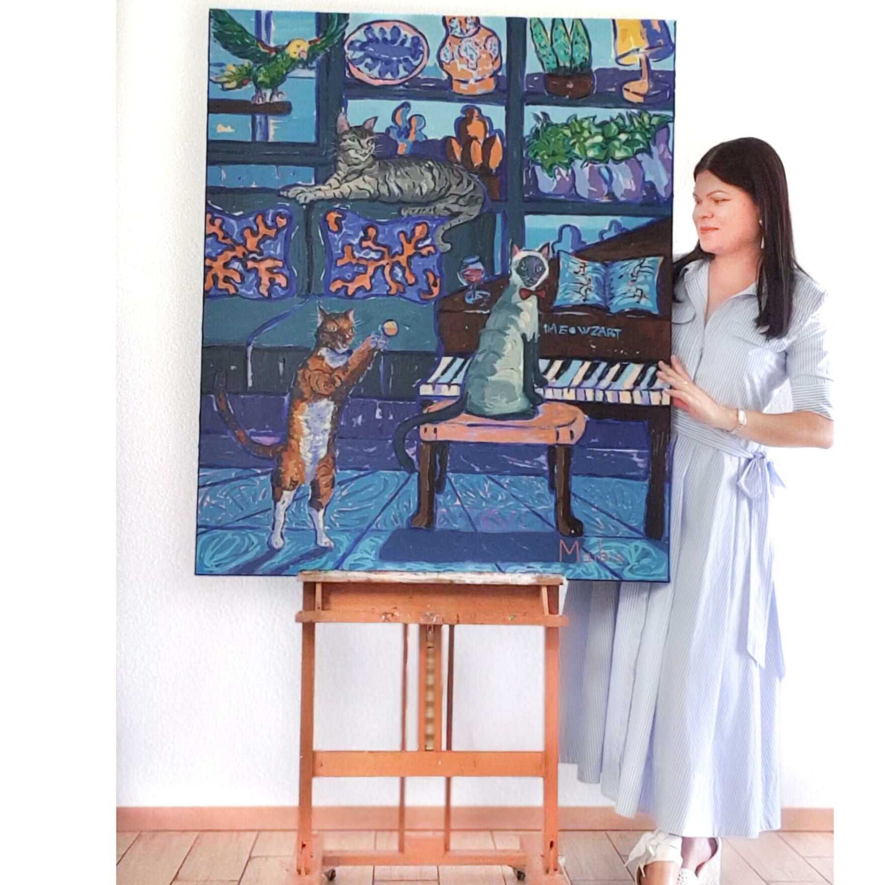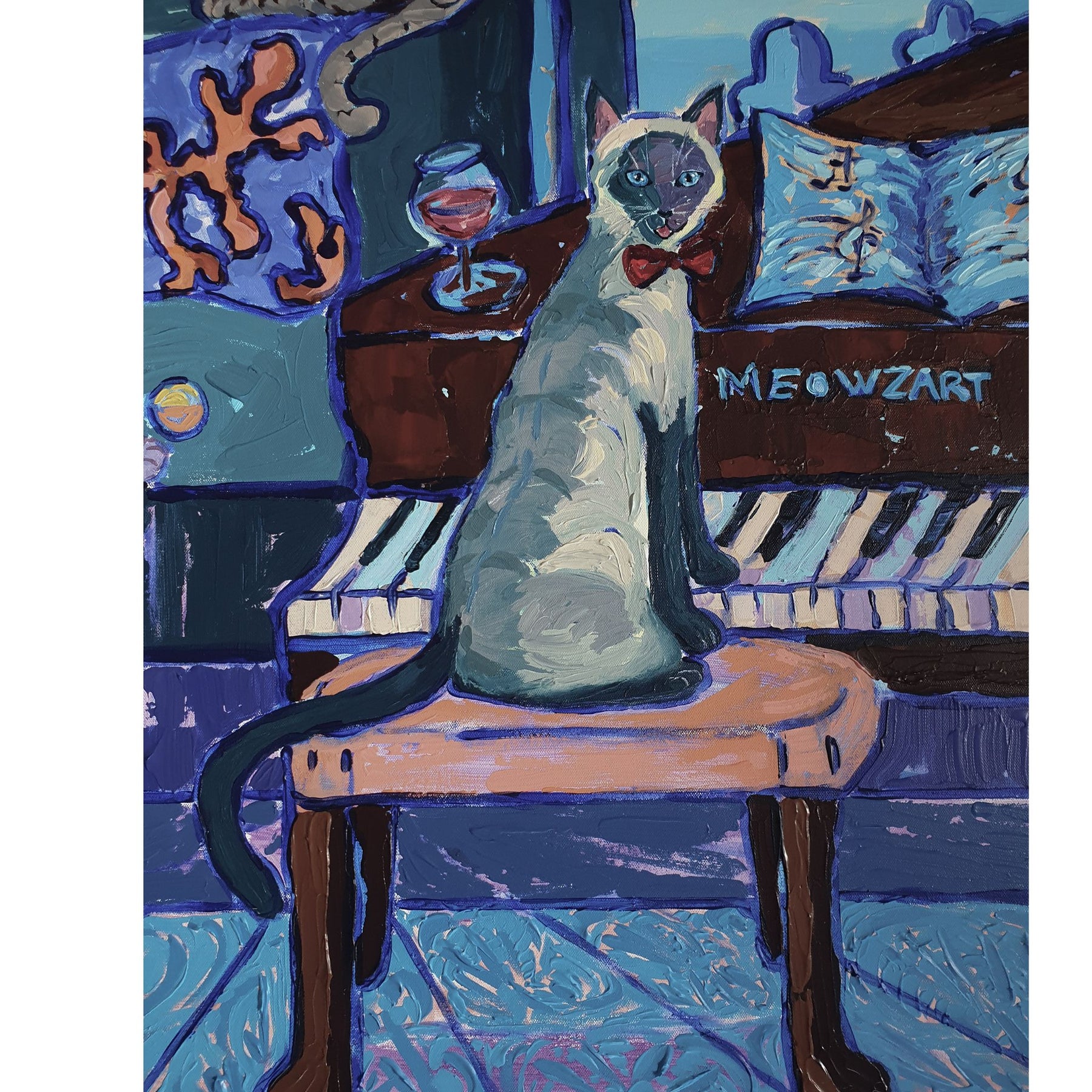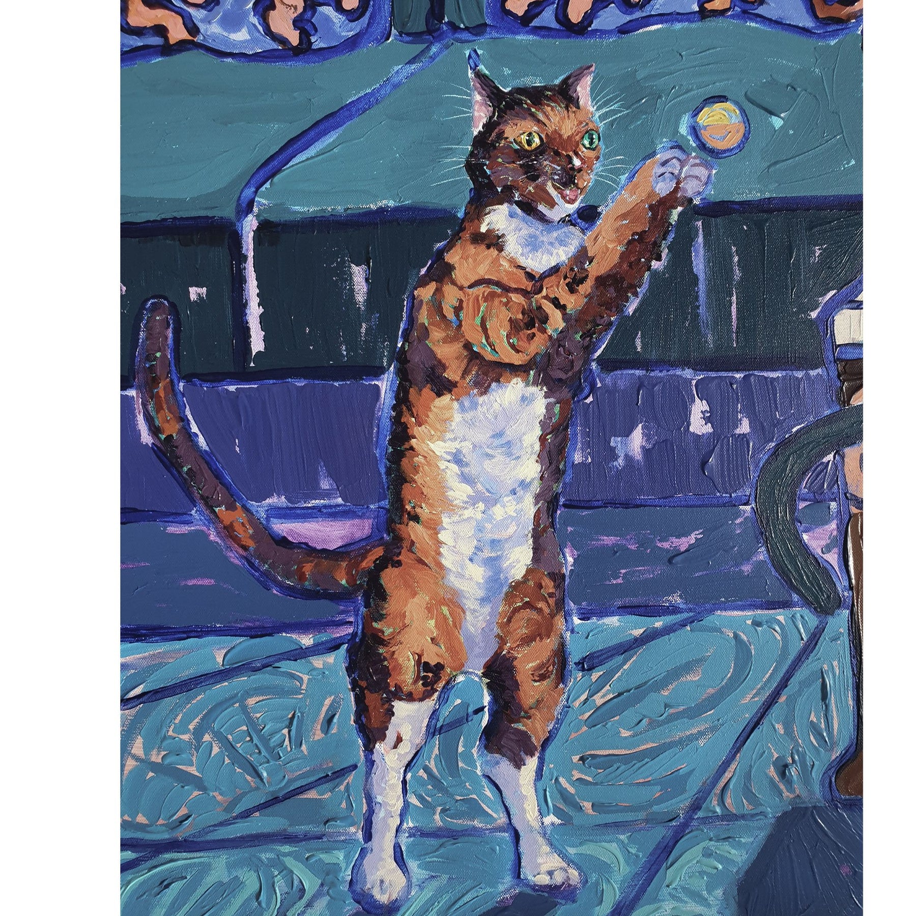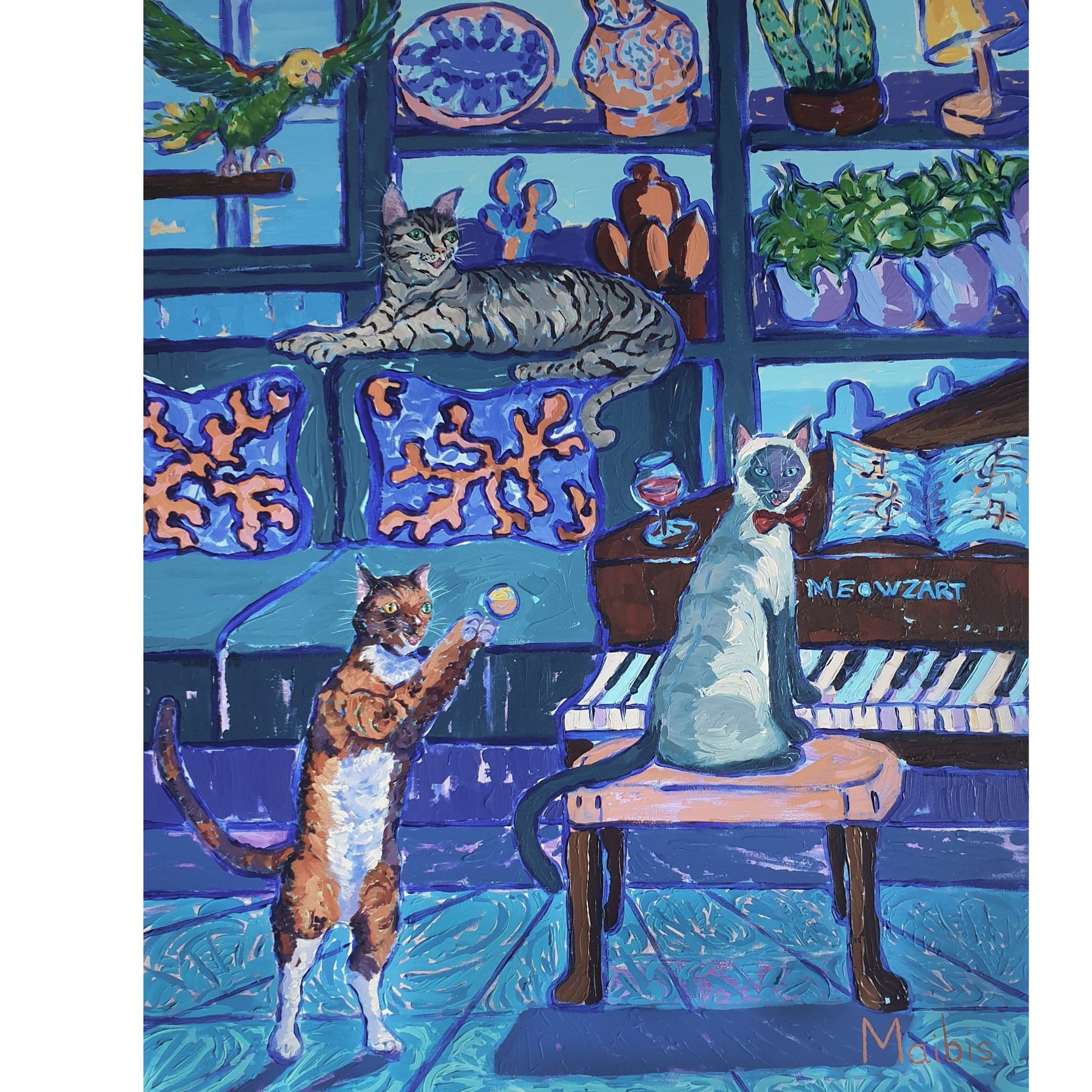 This original artwork captures a serene moment in a blue-hued room where three distinct felines share space with a vibrant parrot. A graceful Siamese cat perches elegantly on a piano chair, while a playful calico cat pounces on a ball with unbridled joy. A thoughtful tabby cat observes the scene with quiet contemplation as the parrot spreads its wings in dynamic motion. The composition is enriched by sea-themed décor and delicate corals that infuse the space with coastal charm, creating a whimsical narrative where domesticity meets oceanic wonder.