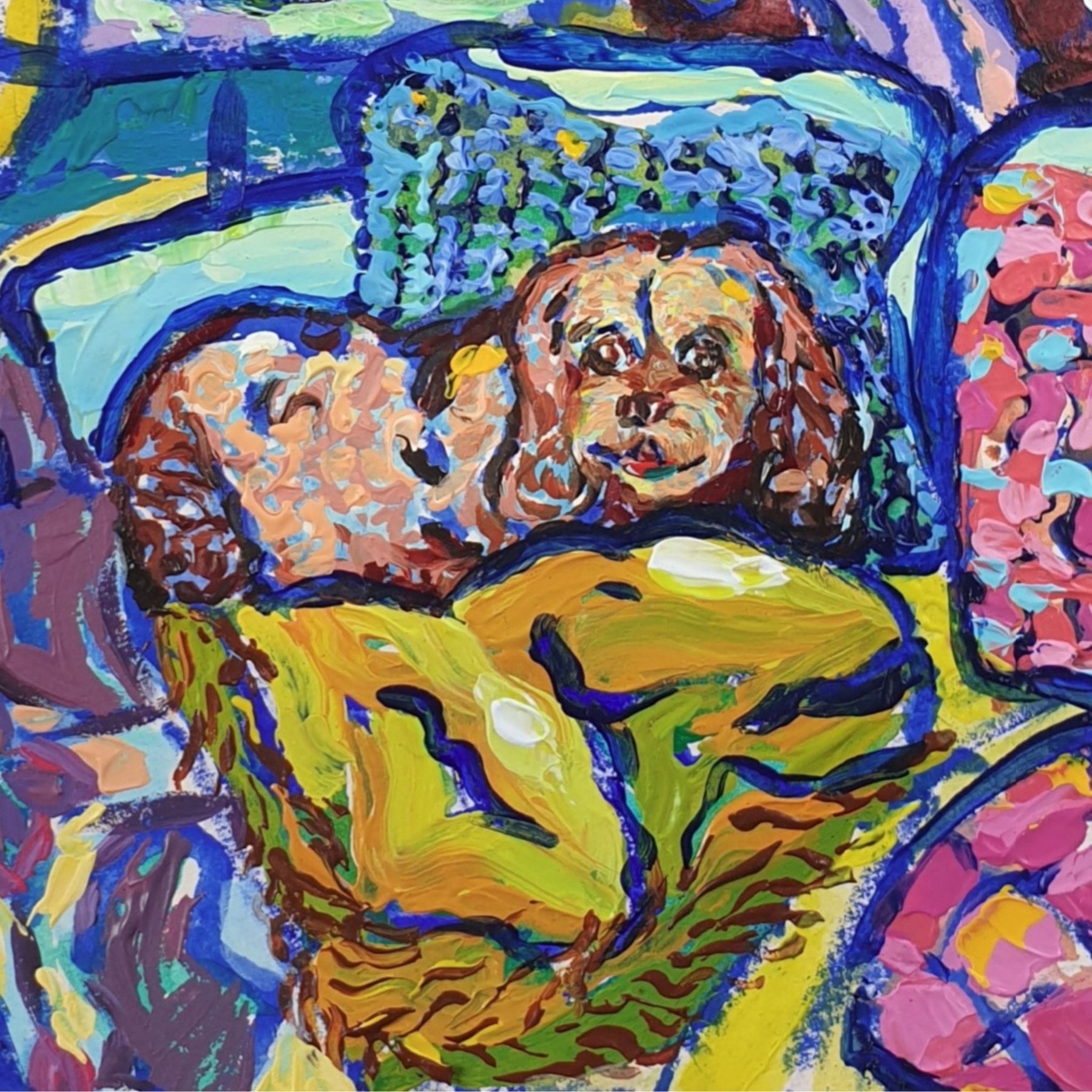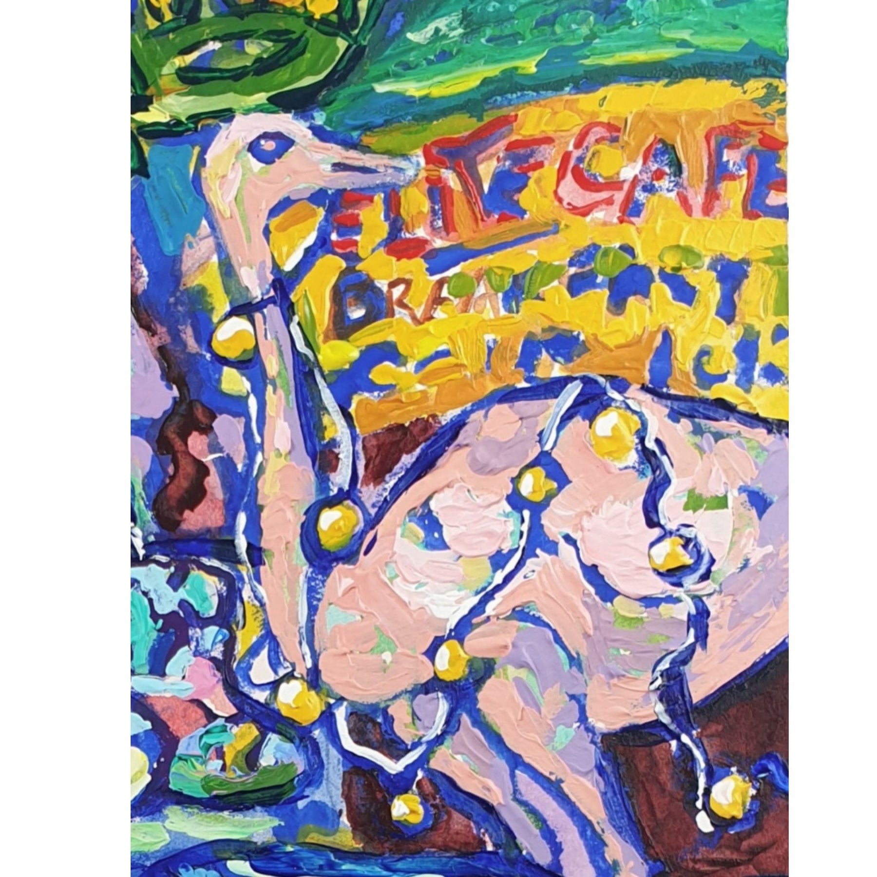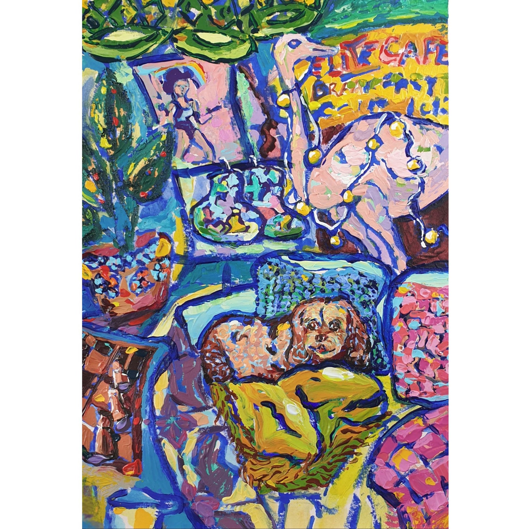 Meet Billy & Beyoncé the Ostrich,a charming art piece that brings warmth and personality to any room. This whimsical creation captures a cozy moment of companionship, featuring a relaxed dog nestled in a soft yellow blanket on a living room couch, with an elegant vintage ostrich standing proudly in the background. Surrounded by thoughtfully curated home décor including artwork, stockings, lighting, and lush greenery, the piece celebrates the beauty of domestic comfort. The harmonious blend of pink, blue, and green tones creates a soothing, inviting atmosphere that transforms your space into a gallery of joy and connection.