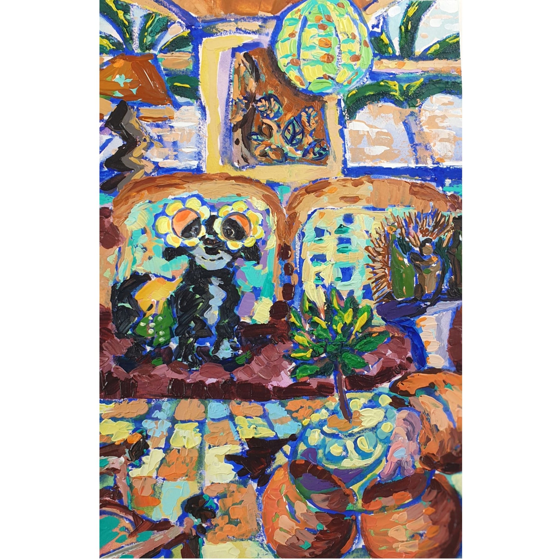 Lola in California captures a sun-soaked moment of pure relaxation. This warm, inviting scene features a stylish black dog standing on a plush sofa, complete with fashionable sunglasses that perfectly match the laid-back California vibe. Soft pillows surround her as natural light streams through windows framing swaying palm trees. A potted plant adds greenery to the foreground, while a ceiling lamp casts a gentle glow across the cozy living room. Rich browns, golden yellows, and earthy greens create a harmonious palette that radiates comfort and coastal charm. Perfect for anyone who appreciates art that brings warmth and personality to their space.